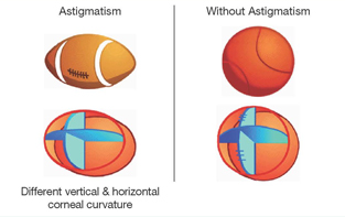 In astigmatism, the curvature of the cornea is different along different axes. As a result, light rays entering the eye are focused at different points instead of a single point. This will create a blurry image. The child may suffer from eyestrain, squint the eyes or adopt a head tilt. A child with severe astigmatism requires glasses.