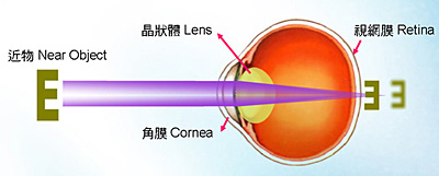 患上近视的眼球比正常较长,因此光线聚焦在视网膜的前面。近物清晰,远物模糊。 -